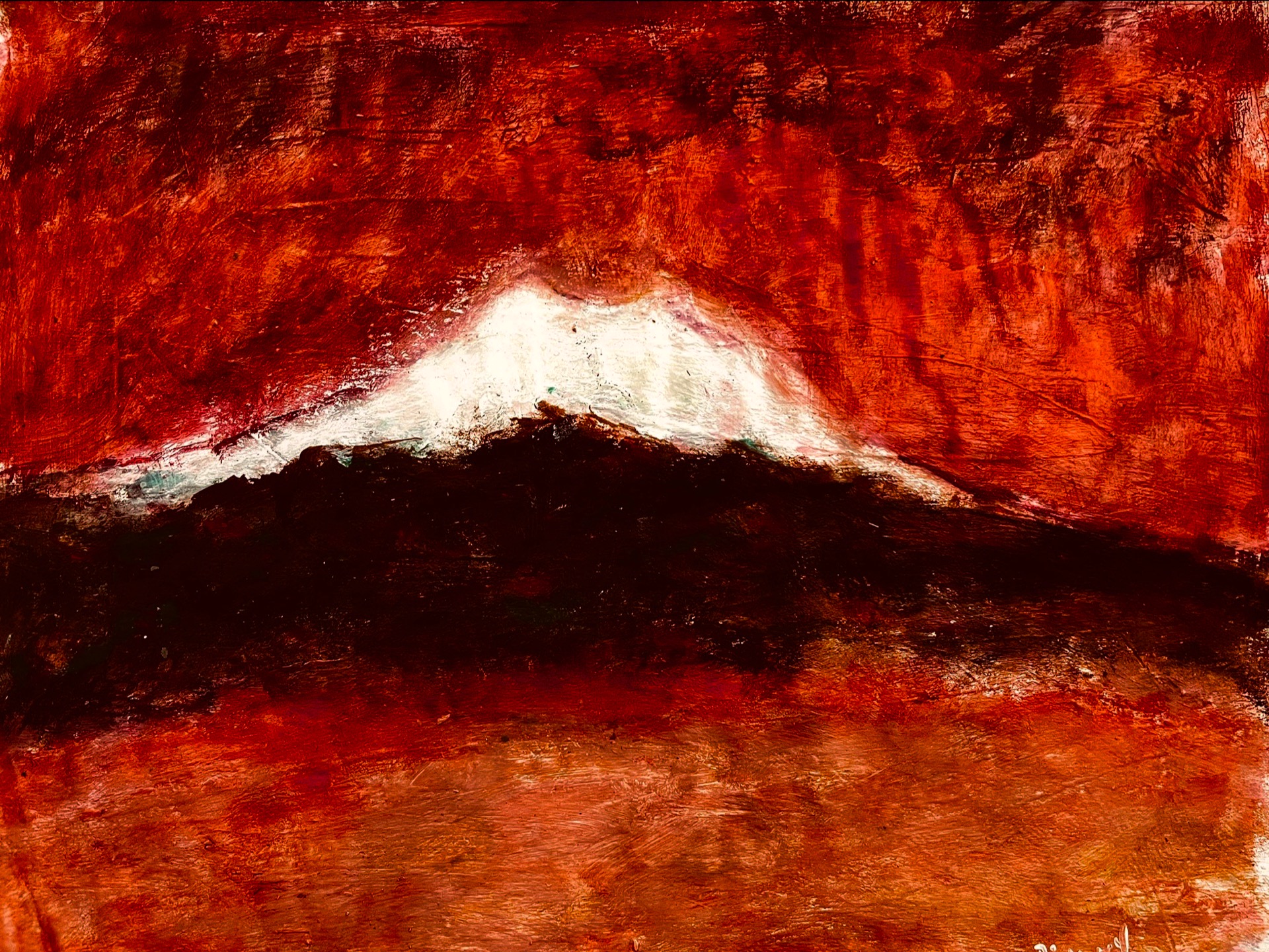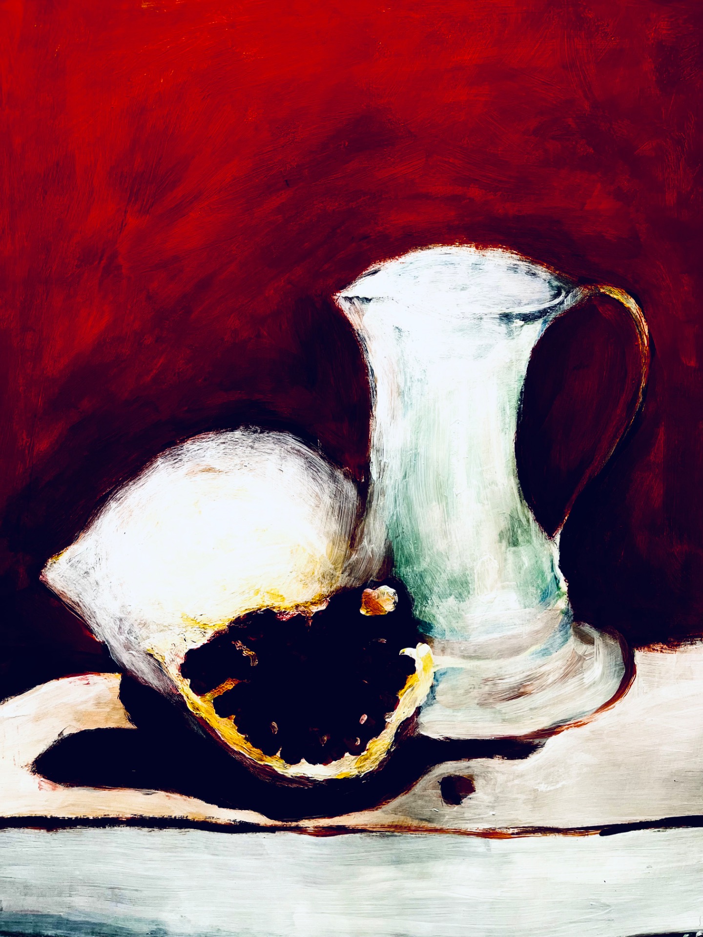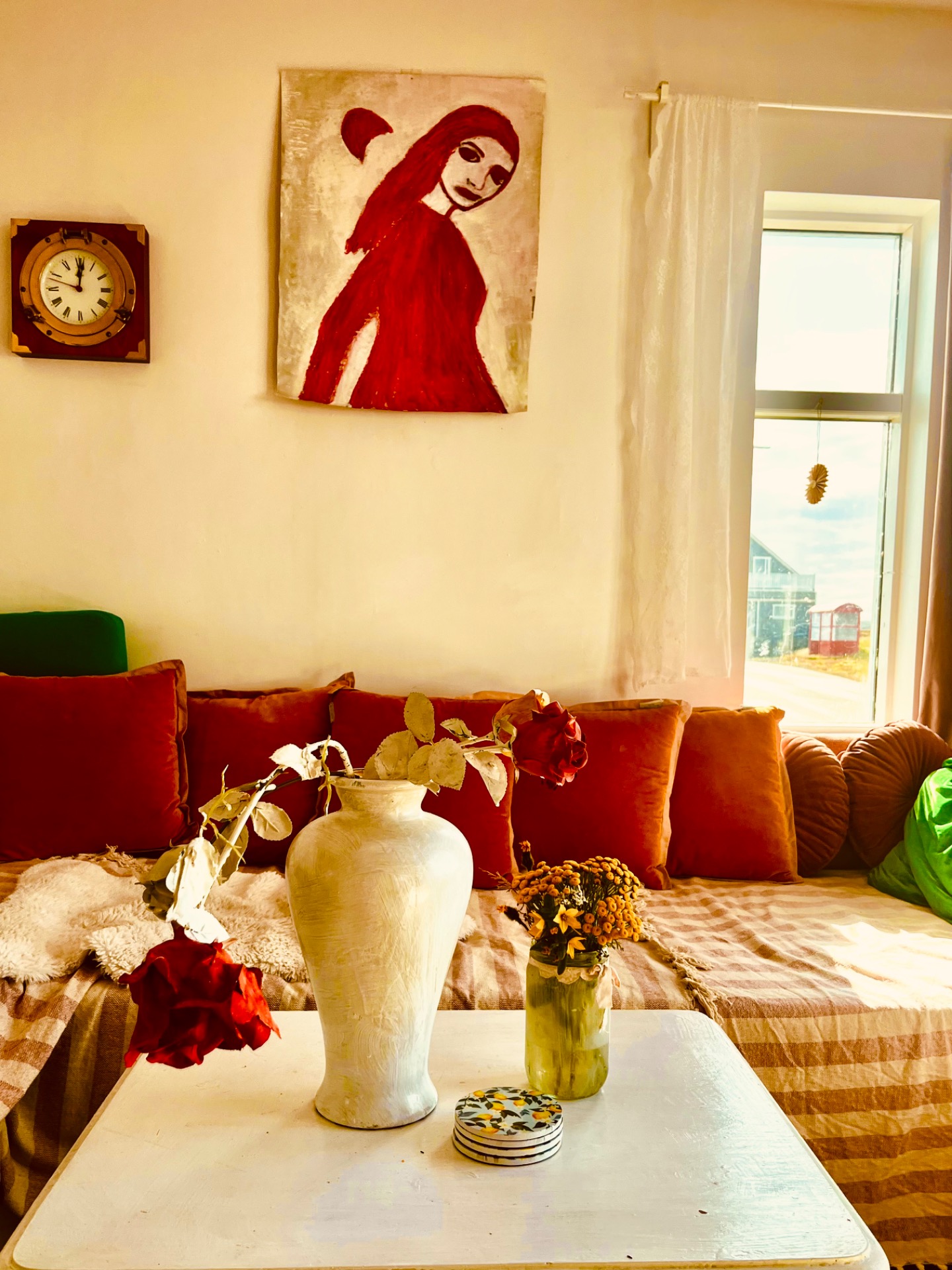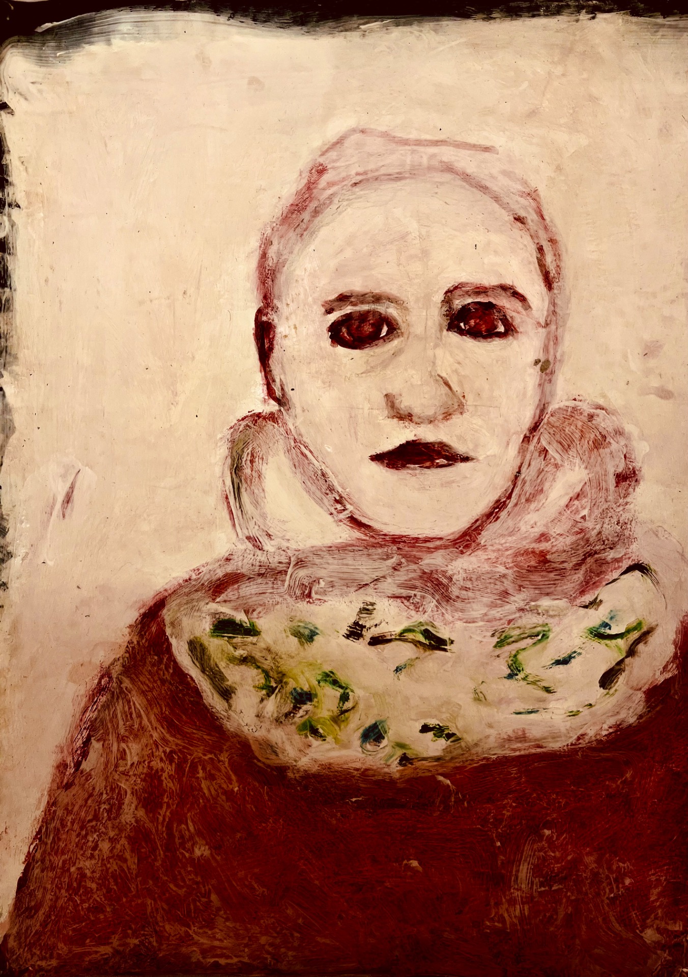 From behind the reds, you can see a little scarlet poppy. Possibly even a river of blood trickling down her neck, removing her from herself for a fate of pain and suffering among others.